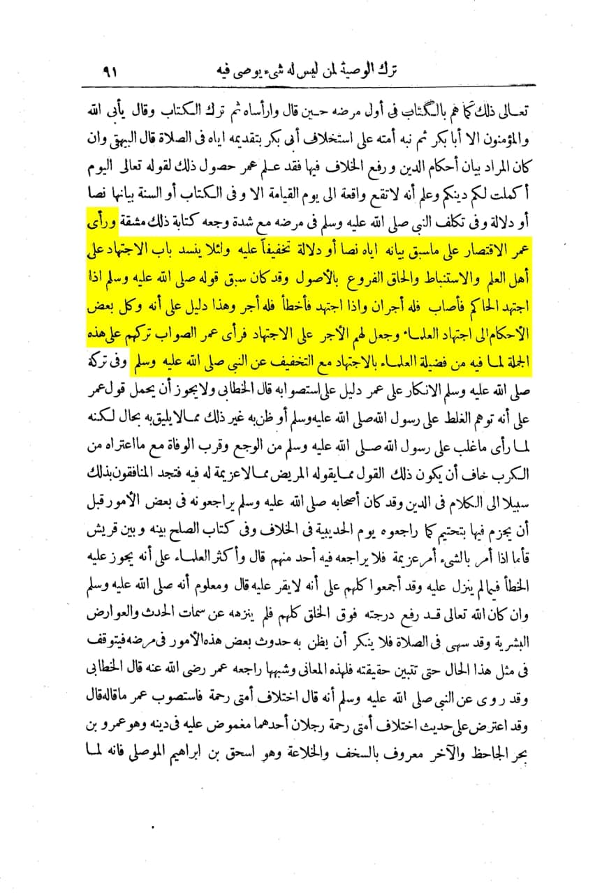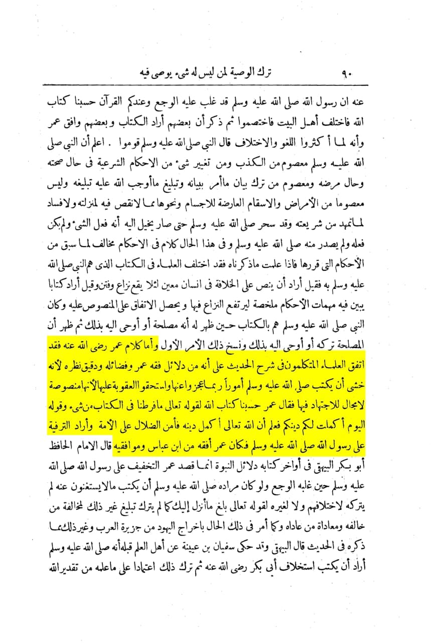 اما سخن عمر علماي متکلم در شرح حديث اتفاق نظر دارند که اين سخن از دلائل فهم عمر و فضائل و دقت نظر او است چون او مي ترسيد رسول الله مسائلي بنويسد که از انجام آن ناتوان باشند و مستحق عذاب گردند چون نص مي باشد و جايي براي اجتهاد باقي نمي ماند عمر گفت:کتاب خدا براي ما کافي است به خاطر سخن خداي متعال(در کتاب از هيچ چيز فرو گذار نکرديم) و سخن او(امروز دين شما را کامل کردم) عمر فهميد که دين خدا کامل شده است و مردم ديگر گمراه نمي شوند و مي خواست رسول خدا راحت باشد پس عمر از ابن عباس و هم نظران او فقيه تر است...